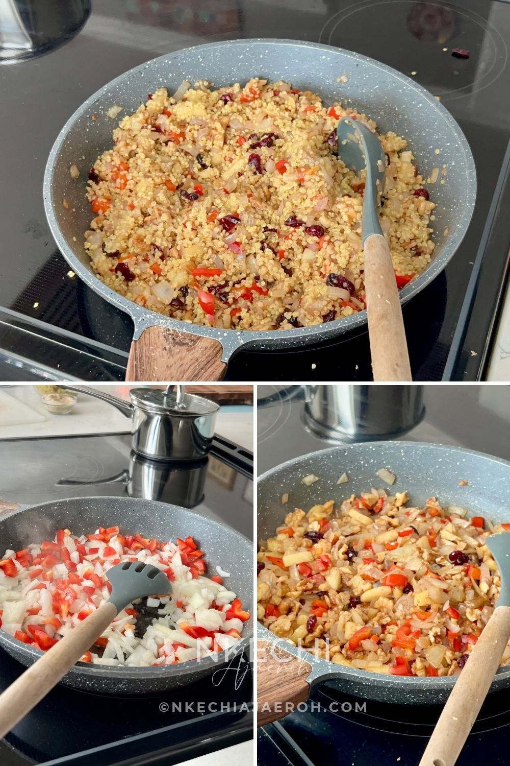 - Sauté the Filling. In a skillet, heat olive oil over medium heat. Add the onion and bell peppers, and cook for 3–4 minutes, until they are soft. Stir in ½ teaspoon spice mix (mentioned in the ingredients section). Then, add the garlic and sauté for an additional 30 seconds. Next, add the apples, and cook for a little longer. Stir in the chopped walnuts, combining, followed by the cranberries. Taste and adjust flavors. Add cooked quinoa and combine with the other ingredients. Cook for 2–3 minutes, stirring. Add spinach if using it. Adjust seasoning to taste and finish cooking.