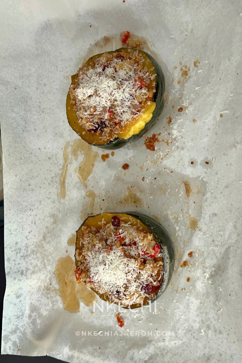 - Stuff and Bake. Once the squash is roasted, flip each half so it’s cut-side up. Spoon the quinoa mixture evenly into each cavity, gently pressing it in. Top with small Parmesan if desired. Return the stuffed squash to the oven for 10 minutes to warm through and allow flavors to meld. You can also bake for 5 minutes and broil for 2-3 minutes.